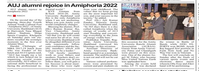Amity University Ranchi Alumni Association organized first Alumni Meet 2022 to bring all the pass out batches of the university in one place to relieve the old student days, reignite and strengthen the bonds, and to give a platform for networking among peer groups and with the University. The event included experience sharing from senior faculties and the alumni, cultural programs from current batch students and Alumni which was the soul of the event and had open interaction sessions with faculties and students of junior batches. Alumni with success stories were also felicitated on the occasion.