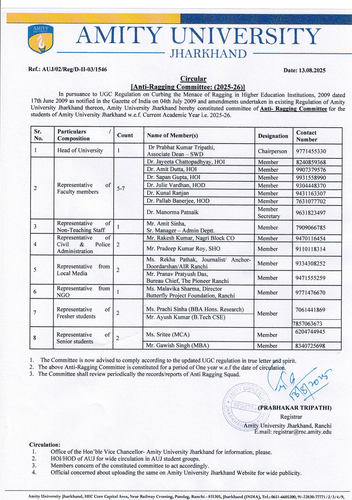 In conformity with Supreme Court judgements and directions, UGC guidelines and State Government Instructions, Amity University Jharkhand is following ‘Zero-Tolerance policy’ towards ragging. Any student of Amity University Jharkhand is accused and found guilty of ragging, will be severely dealt with, in accordance with the Provisions of the Law.