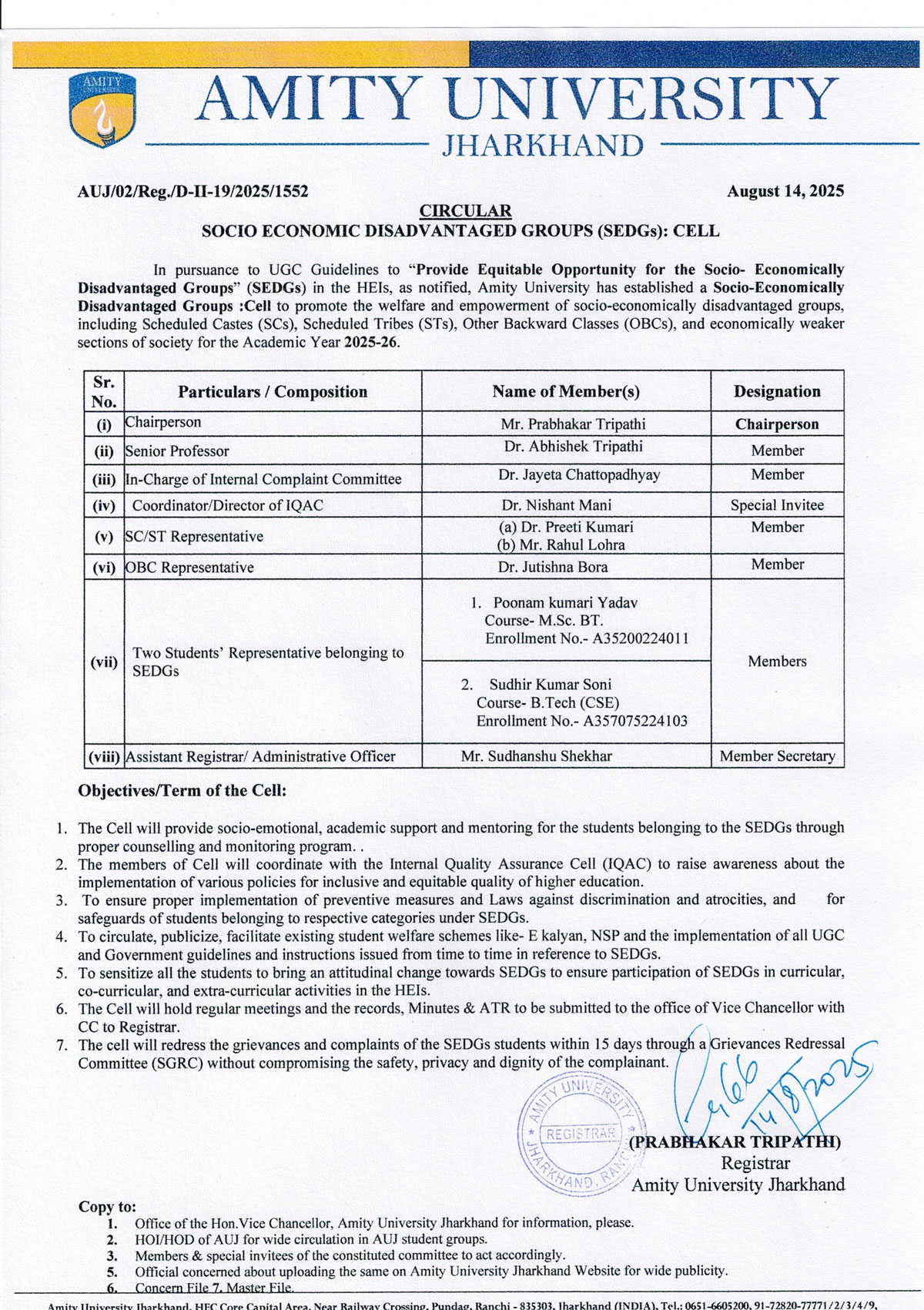 The Socio-Economically Disadvantaged Groups (SEDG) Cell is dedicated to supporting students from underprivileged backgrounds by promoting equity, inclusion, and equal opportunities within the academic environment. The cell focuses on providing guidance, resources, and support services to help these students overcome socio-economic challenges, ensuring their holistic development and academic success.